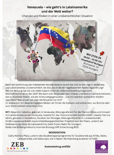 Nach der Entführung des Präsidenten Nicolás Maduro durch die USA ist die Lage in Venezuela und Lateinamerika unübersichtlich. Ist dies das Ende der regelbasierten Nachkriegsordnung? Welche Wirkung hat die von vielen Expert:innen als völkerrechtswidrig eingestufte Machtdemonstration der USA? Wie kann sich Venezuela nach Chávez und Maduro weiterentwickeln, wie zu Stabilität finden, wie der Armut entgegenwirken – und mit welchen politischen Köpfen eigentlich? Was wissen wir über die Situation vor Ort?